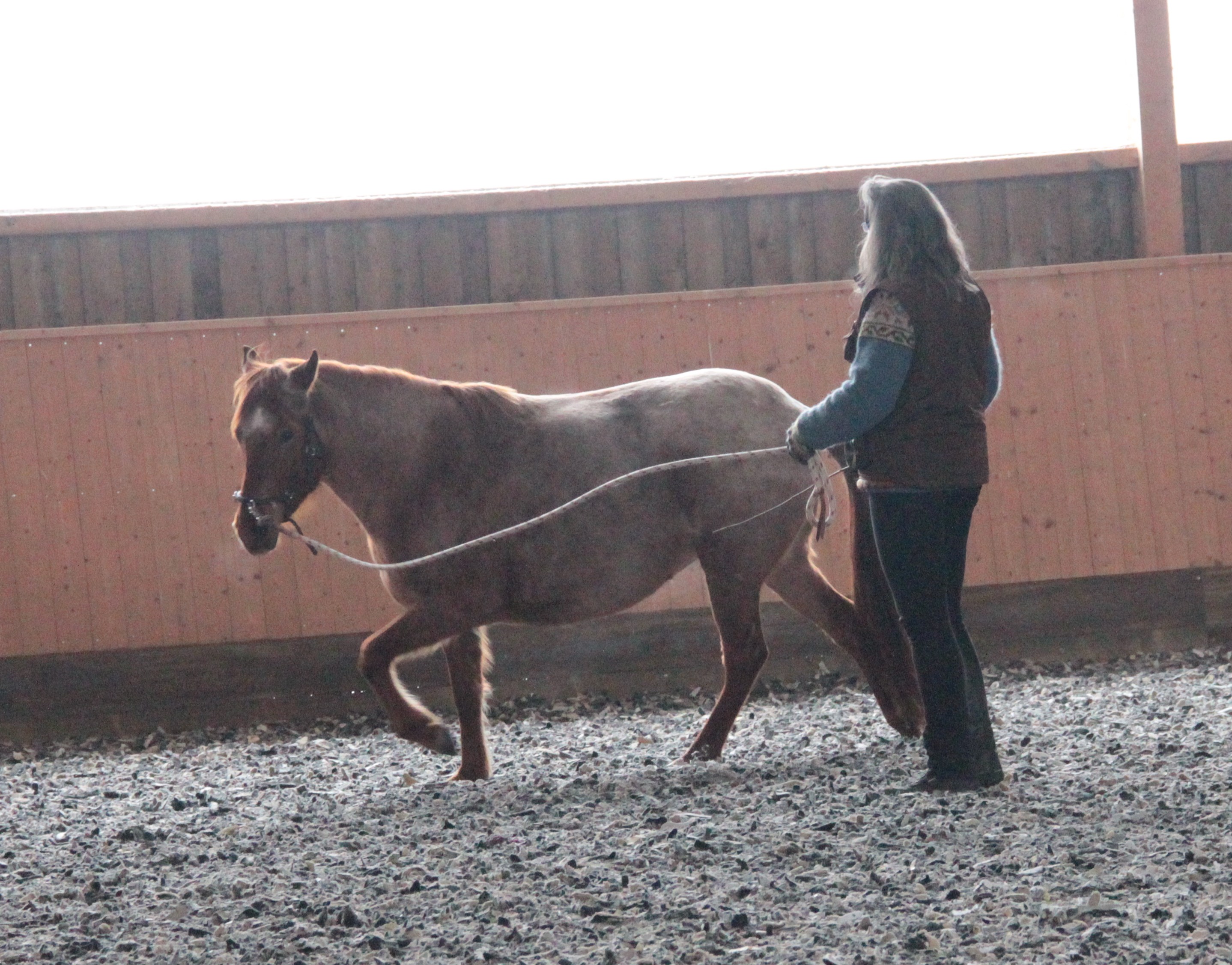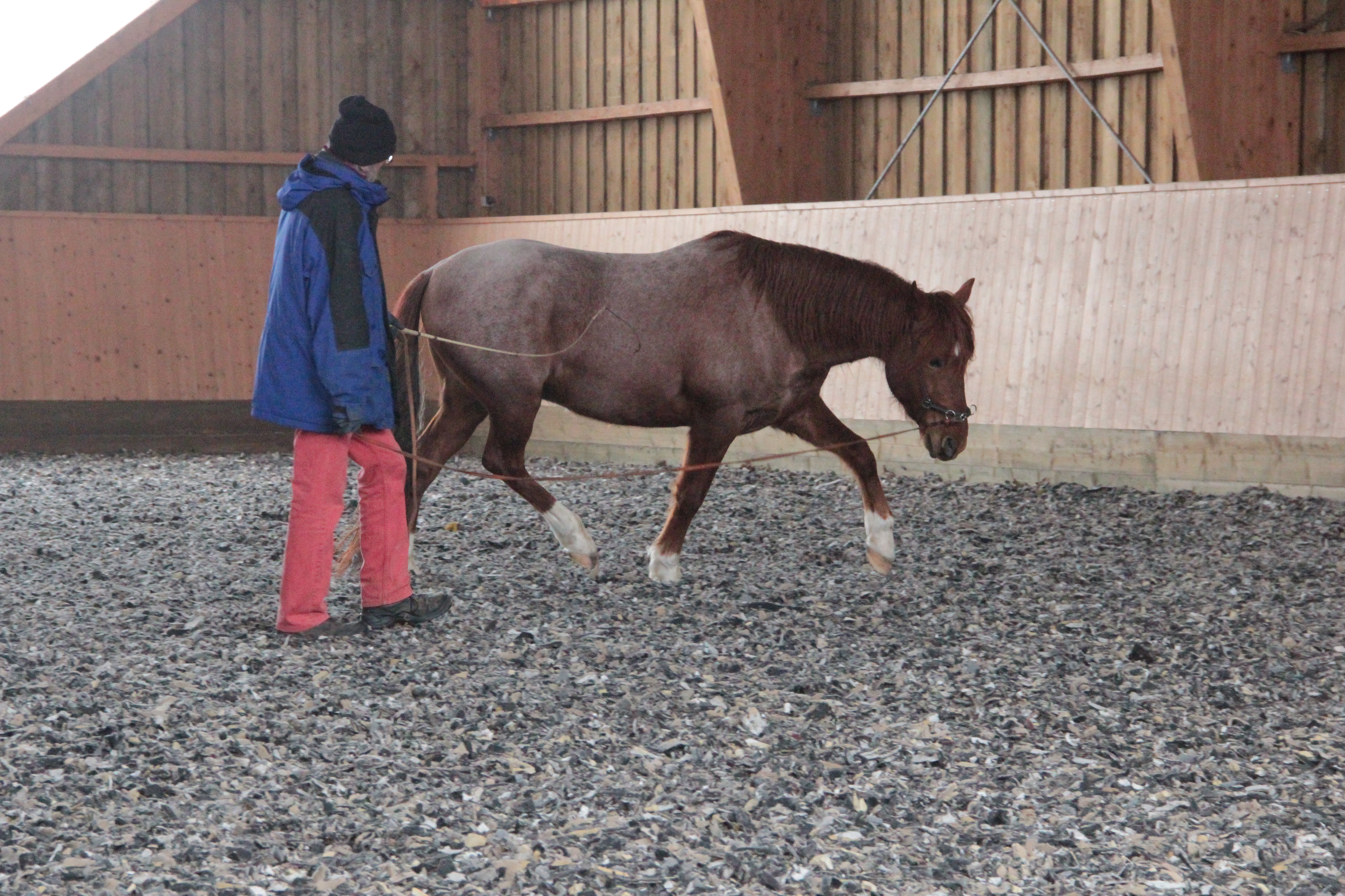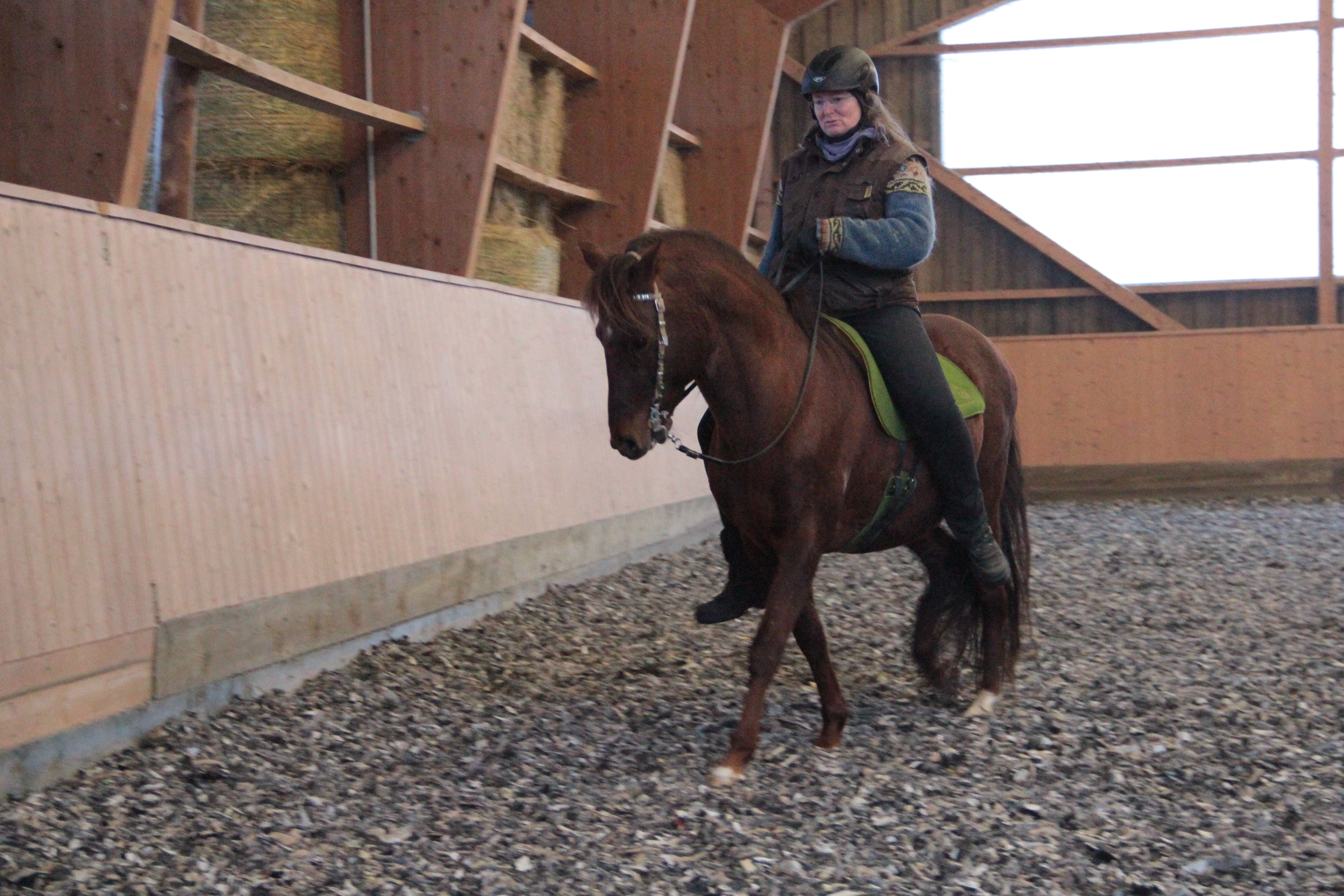 För mig som gammal islandshästryttare var det väldigt intressant att se Isabels alla Paso Peruanos! Jag har aldrig tidigare sett den rasen. Precis som islandshästen så är det en gångartshäst, som kan ha fyra eller fem gångarter. Till skillnad från islandshästen så är det dock riktiga naturtöltare. Det fick vi bland annat se i longeringen, där hästarna flera gånger valde tölt på hängande lina i en lång och låg form. Det hade nog väldigt få islandshästar gjort! Precis som med islandshästar så var den stora utmaningen med Paso Peruano att få dem att slappna av, länga sin överlinje och arbeta med sin rygg. Det blev inte lättare av att Isabels hästar hade väldigt mycket energi! Men rent generellt var jag positivt överraskad av rasen. Hästarna var vackra, vägbyggda och trevliga! Flera av dem hade också en väldigt intressant färg. De var fuxar med vita stickelhår, framför allt på ryggen, men även en del på sidan. De smälte därmed in i den frostiga naturen. Det såg ut ungefär som att det hade snöat på hästarnas ryggar och att det även låg kvar en del snöflingor på deras sidor. Isabel hade ytterligare en gångartshäst, men bara i ett exemplar, en Agidenberger. Det är en korsning mellan Islandshäst och Paso Peruano. Jag tror att den till 75 procent av Islandshäst och den både ser ut och rör sig ungefär som en Islandshäst.