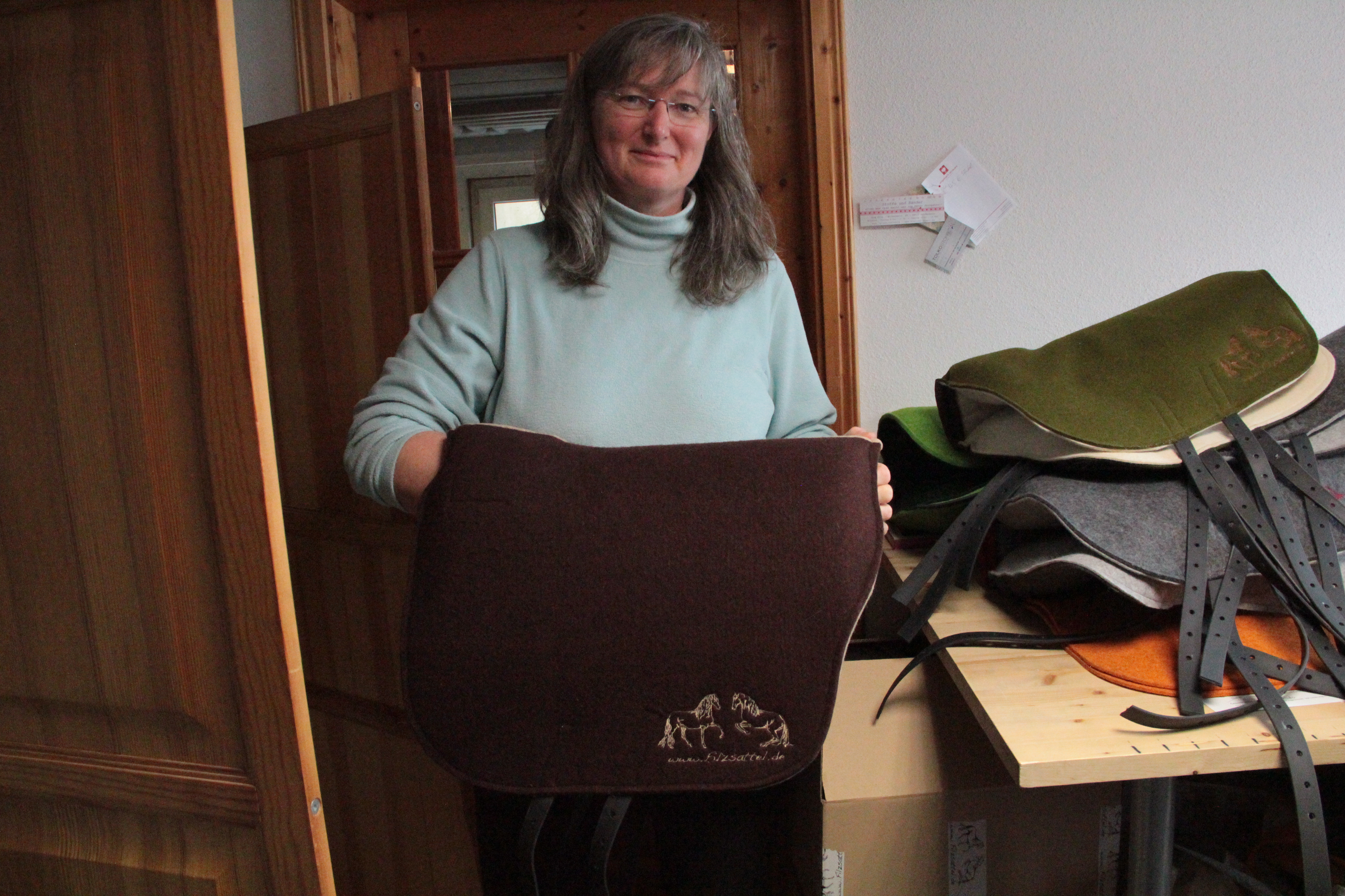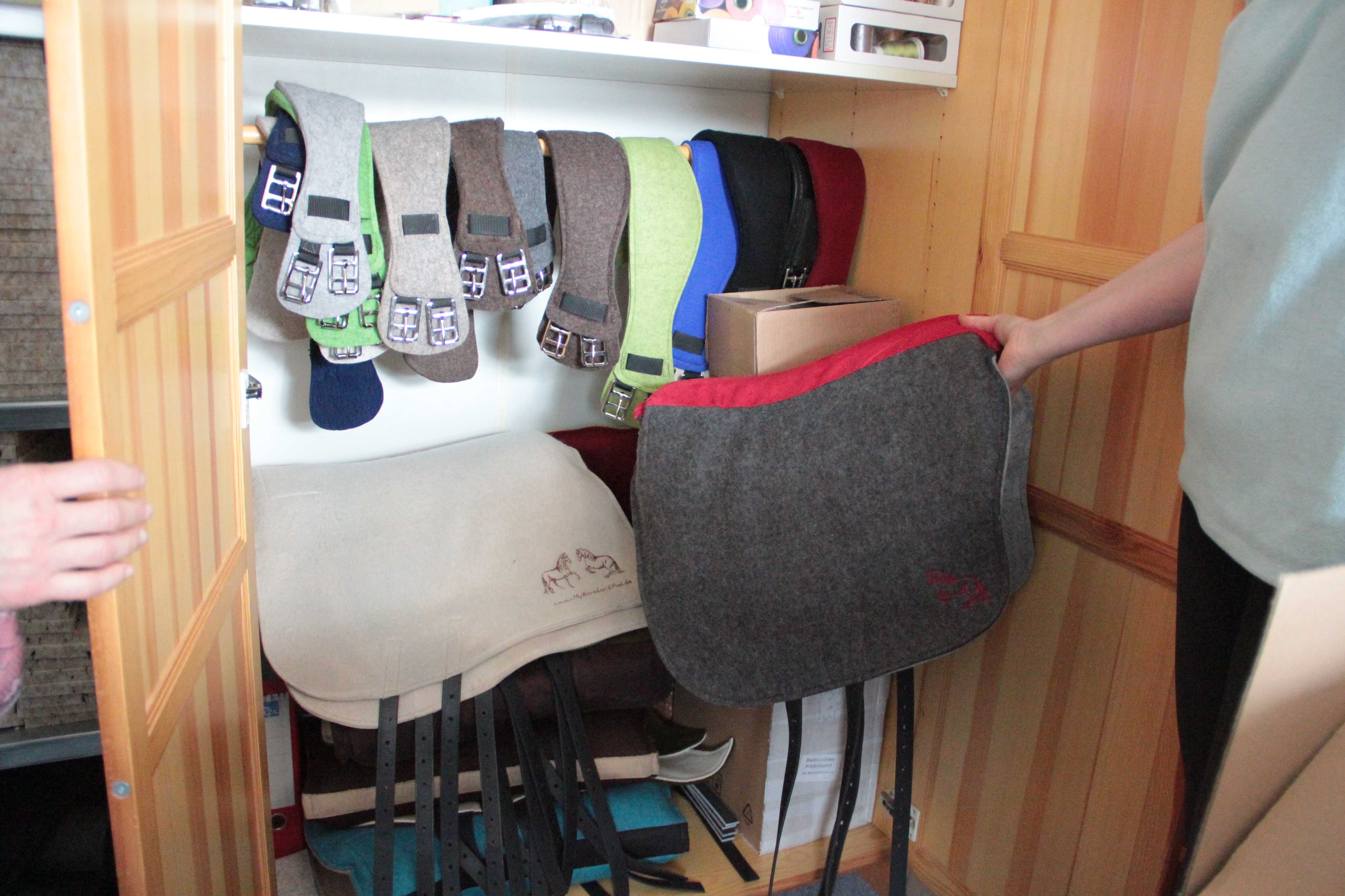 Trots denna fina ritt är det nog som tillverkare av ”filzsattel” som Isabel är mest känd! Den är ett slags mellanting mellan en sadel och en pad. Man får samma närhet till hästen som när man rider barbacka, men samma sits och stabilitet som när man rider i en sadel. Det var väldigt intressant att få se hur filzsatteln är uppbyggd och hur produktionen går till. Elise fick även provrida i en filzsattel, vilket resulterade i att hon inte bara beställde en, utan två sadlar!